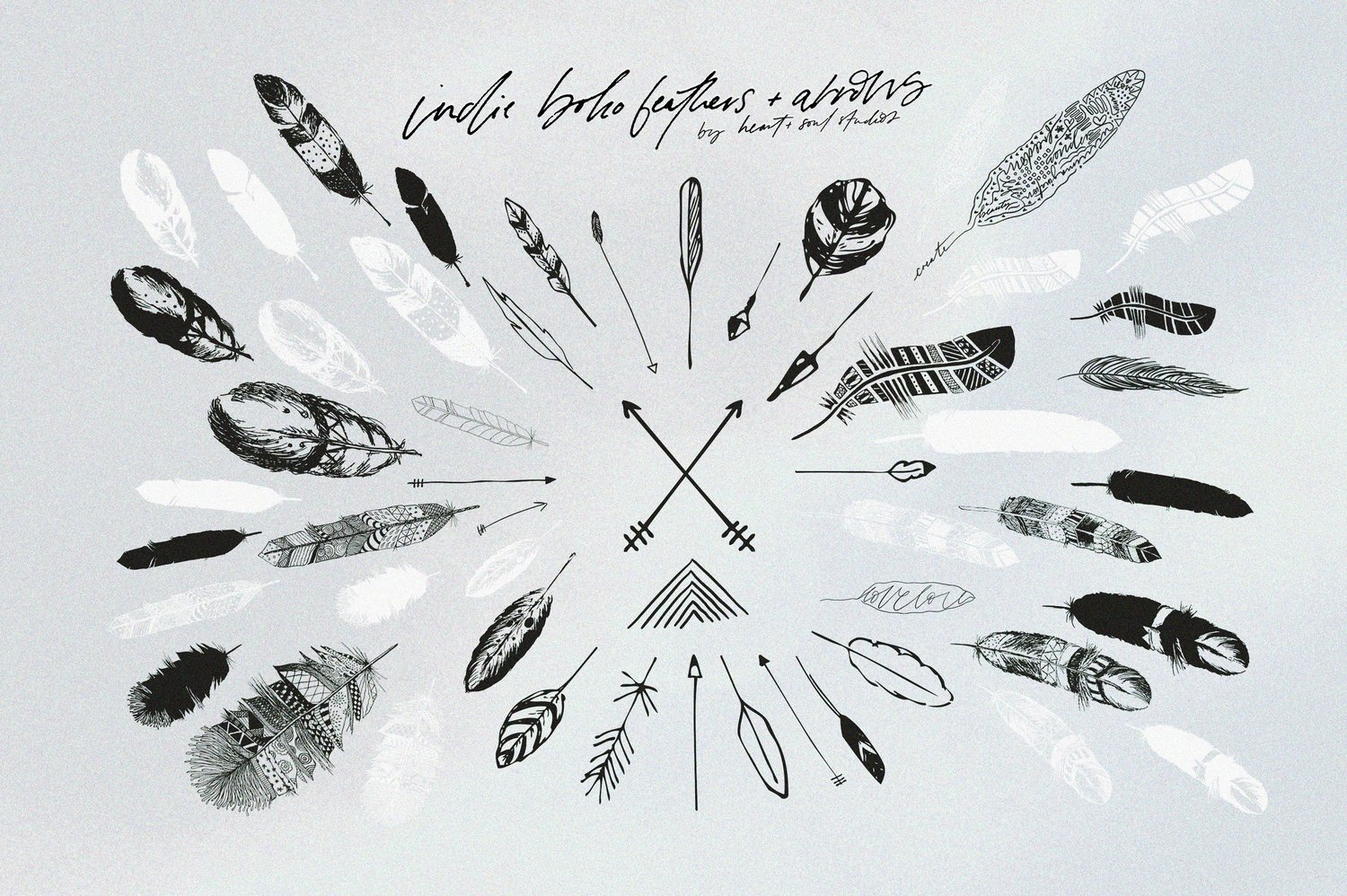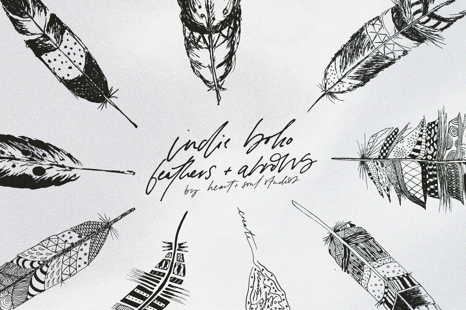 Inspired by the beauty of life in the intricate and detailed, Indie Boho Feathers + Arrows is a wild range of silhouettes and hand-drawn elements, crafted to add a feminine touch to creative projects.